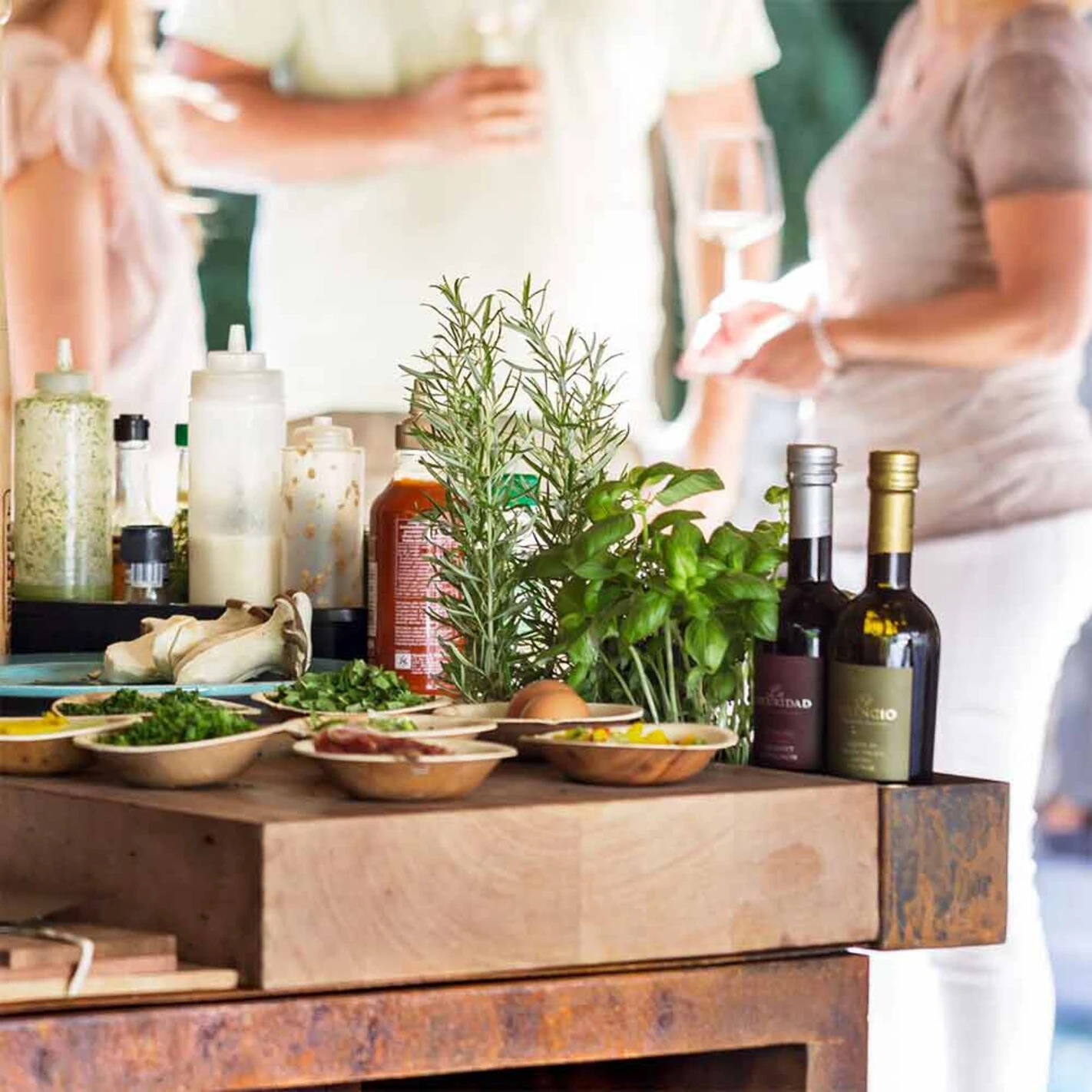 Le plan de travail en teck vous permet de préparer facilement vos aliments et à proximité du brasero.