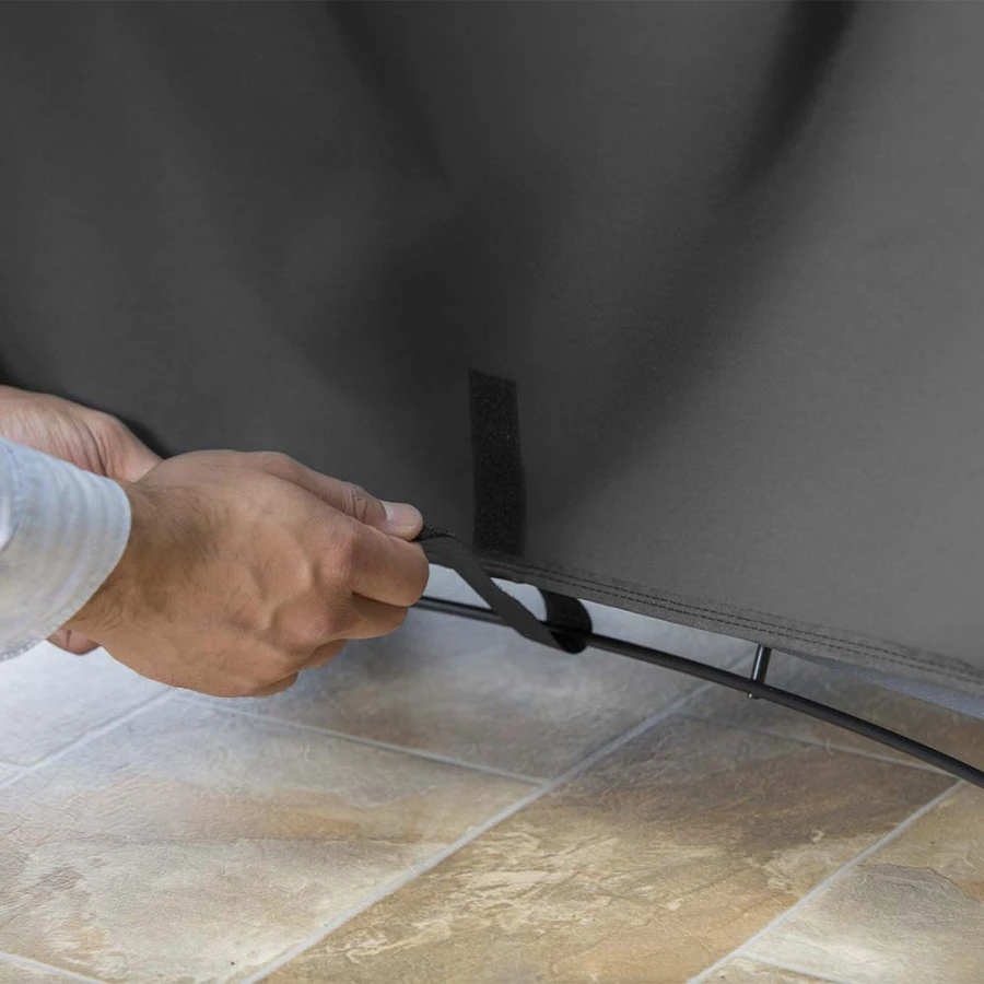Les sangles de fixation maintiennent la housse en toute circonstance, même en cas de rafales de vent. Pratique, la house dispose d’une poignée sur le dessus, il est donc facile de l’enfiler et la retirer.