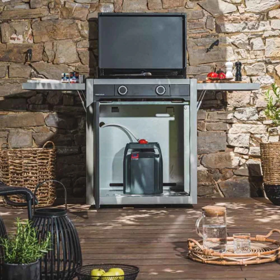 Le chariot à desserte en acier peint gris clair et noir est robuste et préserve des agressions extérieures. Grâce à ses 4 roues pivotantes, transportez votre plancha en toute sécurité. Véritable unité de cuisson, elle dispose de 2 tablettes rabattables ainsi que d’un espace de stockage caché par une porte aimantée.